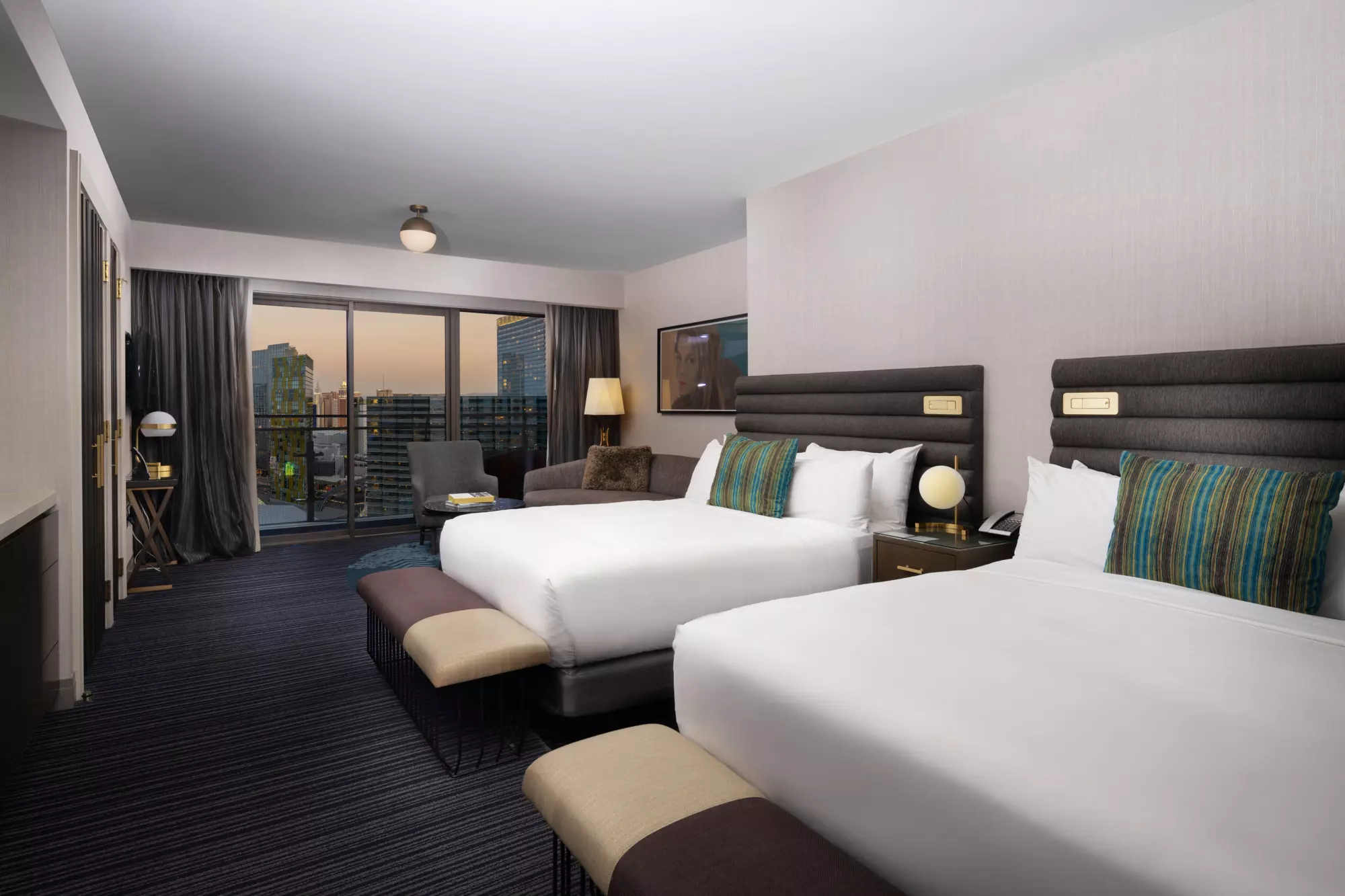 The Two Queen Beds Terrace Studio features warm, welcoming touches and a luxurious bathroom with an exquisite marble floor. Glass doors open onto an expansive private terrace with unparalleled views of The Strip and surrounding areas – a feature not typically found in a luxury Vegas hotel room - to make this one of the best beds in Las Vegas.
